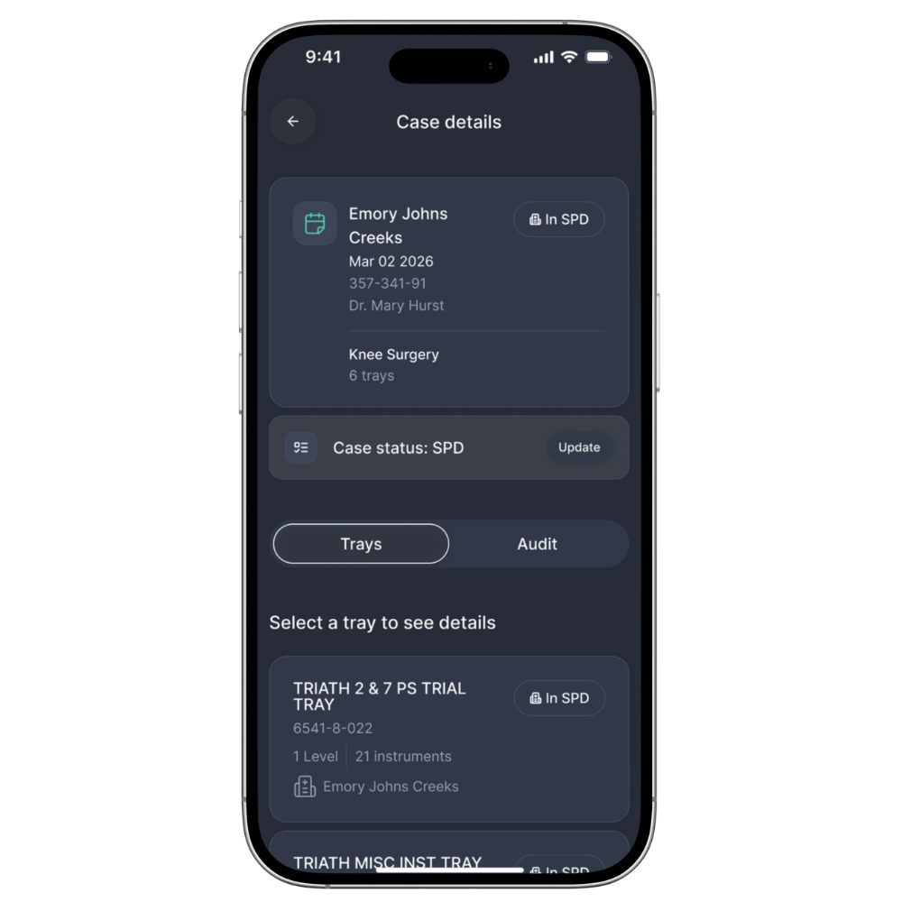 Create a time-stamped record of each tray’s journey from warehouse to OR. Giving couriers, reps, and operators shared, real-time visibility at every step.