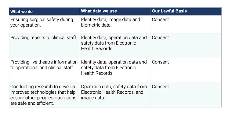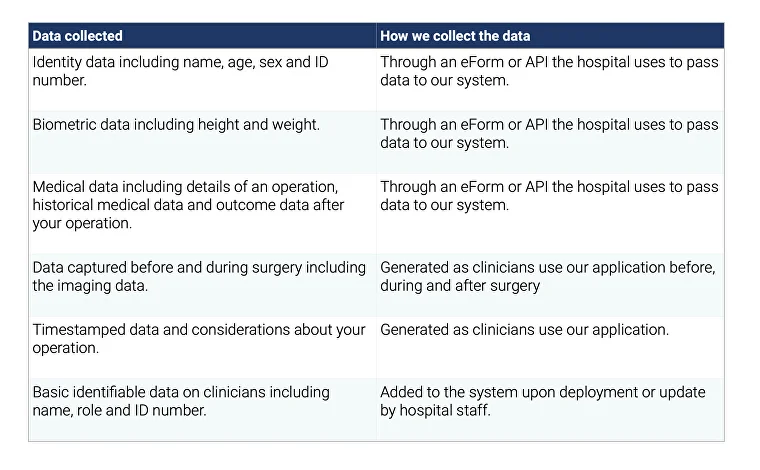 Depending upon your use of the nature of your medical care and what you agree to, we may collect and hold some or all of the personal and non-personal data set out in the table above, using the methods also set out in the table. This includes Special Category medical data.